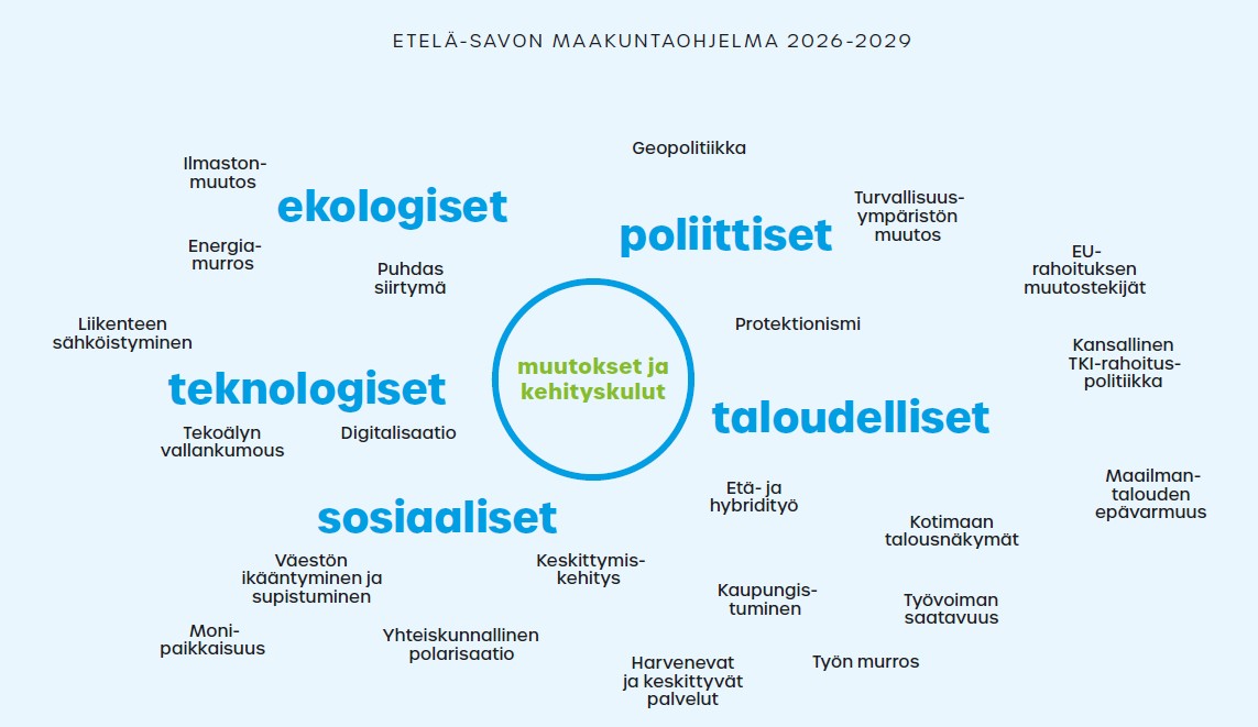 Suomi tai Etelä-Savo ei ole erillinen saareke, vaan vahvasti riippuvainen maailman megatrendeistä ja kehityskuluista. Globaalit toimintaympäristönmuutokset ulottuvat entistä nopeammin ja voimakkaammin Etelä-Savoon. Kriittistä on ennakoida sitä, mitä ulkoisen toimintaympäristön muutokset merkitsevät Etelä-Savon kontekstissa, ja toisaalta sitä, mistä kehityskuluista voidaan tehdä hakea omiin vahvuuksiin pohjautuvaa kilpailuetua.Tärkeää on myös se, että ulkoisen toimintaympäristön havaittuihin ja tiedostettuihin uhkiin osataan varautua. Omilla päätöksillämme ja teoillamme emme useinkaan voi muuttaajonkin kehitysilmiön suuntaa maakunnassa. Sen sijaan voimme vaikuttaa siihen, miten hyödymme maakunnan näkökulmasta myönteisistä kehityssuunnista ja miten onnistumme ennalta torjumaan tai kompensoimaan kannaltamme negatiivisten kehitysilmiöiden vaikutusta. Yllä oleva kuva nostaa esiin maakuntaohjelman työpajoissa vuonna 2025 Etelä-Savon kehityksen kannalta merkittävimpinä pidetyt poliittiset, taloudelliset, sosiaaliset, teknologiset ja ekologiset toimintaympäristön muutokset.